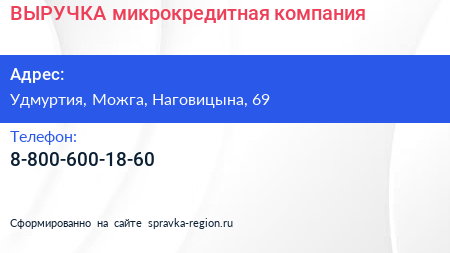 ВЫРУЧКА, микрокредитная компания по адресу Удмуртия, Можга, Наговицына, 69 в дальнейшем Организация, размещена в следующих категориях: