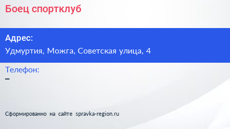 Боец, спортклуб по адресу Удмуртия, Можга, Советская улица, 4 в дальнейшем Организация, размещена в следующих категориях: