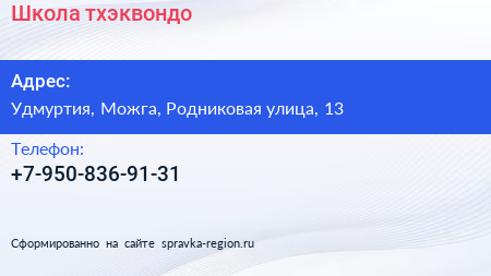 Школа тхэквондо по адресу Удмуртия, Можга, Родниковая улица, 13 в дальнейшем Организация, размещена в следующих категориях:
