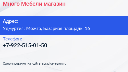 Много Мебели, магазин по адресу Удмуртия, Можга, Базарная площадь, 16 в дальнейшем Организация, размещена в следующих категориях: