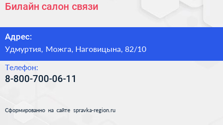 Билайн, салон связи по адресу Удмуртия, Можга, Наговицына, 82/10 в дальнейшем Организация, размещена в следующих категориях: