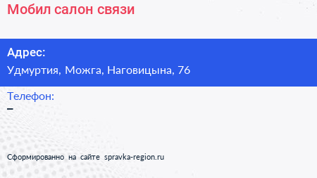 Мобил, салон связи по адресу Удмуртия, Можга, Наговицына, 76 в дальнейшем Организация, размещена в следующих категориях: