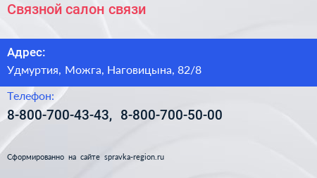 Связной, салон связи по адресу Удмуртия, Можга, Наговицына, 82/8 в дальнейшем Организация, размещена в следующих категориях: