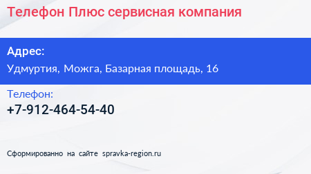 Телефон Плюс, сервисная компания по адресу Удмуртия, Можга, Базарная площадь, 16 в дальнейшем Организация, размещена в следующих категориях: