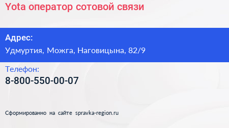 Yota, оператор сотовой связи по адресу Удмуртия, Можга, Наговицына, 82/9 в дальнейшем Организация, размещена в следующих категориях: