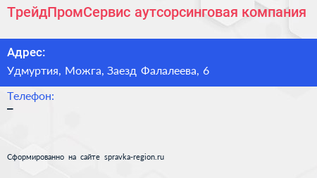 ТрейдПромСервис, аутсорсинговая компания по адресу Удмуртия, Можга, Заезд Фалалеева, 6 в дальнейшем Организация, размещена в следующих категориях: