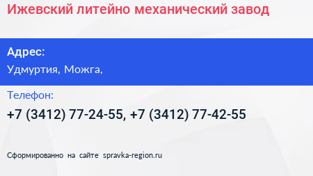 Ижевский литейно-механический завод по адресу Удмуртия, Можга, в дальнейшем Организация, размещена в следующих категориях: