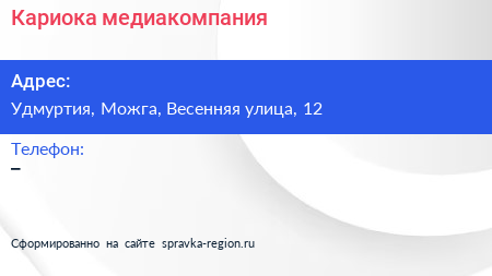 Кариока, медиакомпания по адресу Удмуртия, Можга, Весенняя улица, 12 в дальнейшем Организация, размещена в следующих категориях: