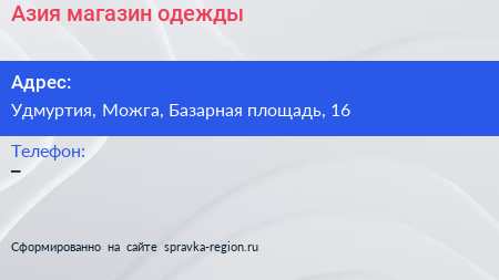 Азия, магазин одежды по адресу Удмуртия, Можга, Базарная площадь, 16 в дальнейшем Организация, размещена в следующих категориях: