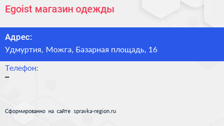Egoist, магазин одежды по адресу Удмуртия, Можга, Базарная площадь, 16 в дальнейшем Организация, размещена в следующих категориях:
