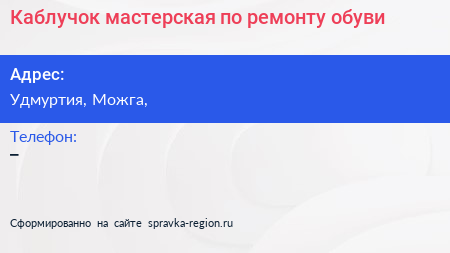 Каблучок, мастерская по ремонту обуви по адресу Удмуртия, Можга, в дальнейшем Организация, размещена в следующих категориях: