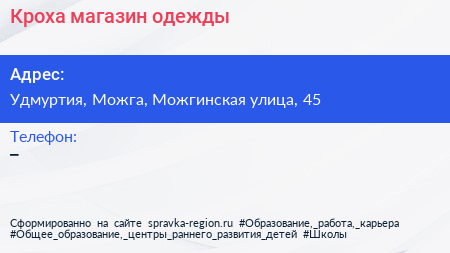 Кроха, магазин одежды по адресу Удмуртия, Можга, Можгинская улица, 45 в дальнейшем Организация, размещена в следующих категориях: