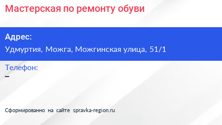 Мастерская по ремонту обуви по адресу Удмуртия, Можга, Можгинская улица, 51/1 в дальнейшем Организация, размещена в следующих категориях: