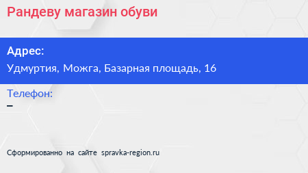 Рандеву, магазин обуви по адресу Удмуртия, Можга, Базарная площадь, 16 в дальнейшем Организация, размещена в следующих категориях:
