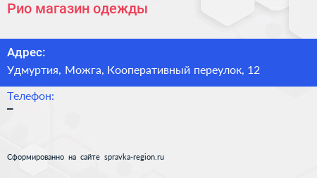 Рио, магазин одежды по адресу Удмуртия, Можга, Кооперативный переулок, 12 в дальнейшем Организация, размещена в следующих категориях: