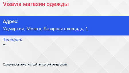 Visavis, магазин одежды по адресу Удмуртия, Можга, Базарная площадь, 1 в дальнейшем Организация, размещена в следующих категориях: