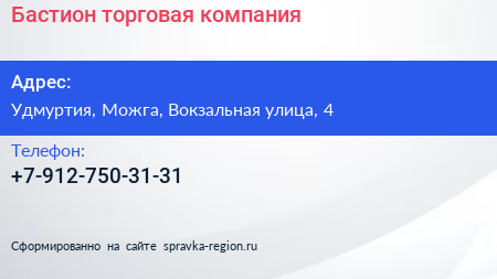Бастион, торговая компания по адресу Удмуртия, Можга, Вокзальная улица, 4 в дальнейшем Организация, размещена в следующих категориях: