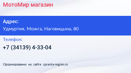 МотоМир, магазин по адресу Удмуртия, Можга, Наговицына, 80 в дальнейшем Организация, размещена в следующих категориях: