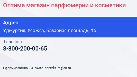 Оптима, магазин парфюмерии и косметики по адресу Удмуртия, Можга, Базарная площадь, 16 в дальнейшем Организация, размещена в следующих категориях: