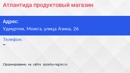 Атлантида, продуктовый магазин по адресу Удмуртия, Можга, улица Азина, 26 в дальнейшем Организация, размещена в следующих категориях: