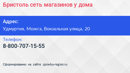 Бристоль, сеть магазинов у дома по адресу Удмуртия, Можга, Вокзальная улица, 20 в дальнейшем Организация, размещена в следующих категориях: