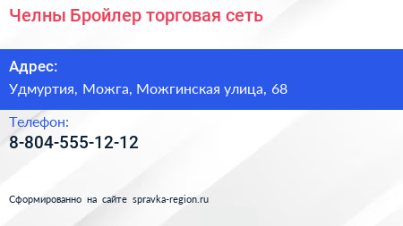 Челны-Бройлер, торговая сеть по адресу Удмуртия, Можга, Можгинская улица, 68 в дальнейшем Организация, размещена в следующих категориях: