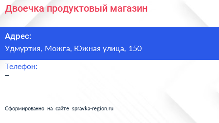 Двоечка, продуктовый магазин по адресу Удмуртия, Можга, Южная улица, 150 в дальнейшем Организация, размещена в следующих категориях: