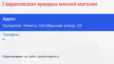 Гавриловская ярмарка, мясной магазин по адресу Удмуртия, Можга, Октябрьская улица, 22 в дальнейшем Организация, размещена в следующих категориях: