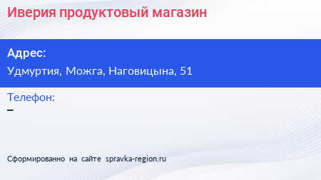 Иверия, продуктовый магазин по адресу Удмуртия, Можга, Наговицына, 51 в дальнейшем Организация, размещена в следующих категориях: