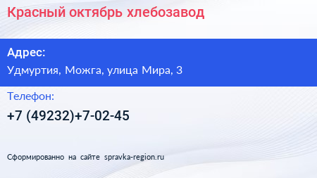 Красный октябрь, хлебозавод по адресу Удмуртия, Можга, улица Мира, 3 в дальнейшем Организация, размещена в следующих категориях: