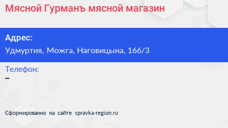 Мясной Гурманъ, мясной магазин по адресу Удмуртия, Можга, Наговицына, 166/3 в дальнейшем Организация, размещена в следующих категориях: