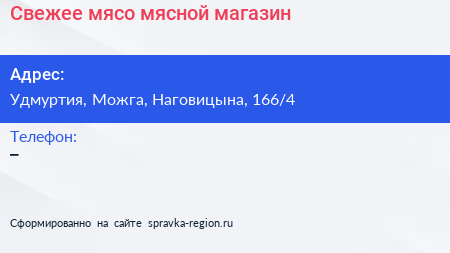 Свежее мясо, мясной магазин по адресу Удмуртия, Можга, Наговицына, 166/4 в дальнейшем Организация, размещена в следующих категориях:
