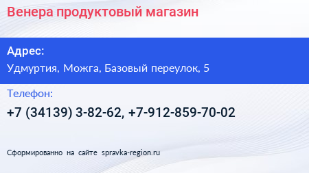 Венера, продуктовый магазин по адресу Удмуртия, Можга, Базовый переулок, 5 в дальнейшем Организация, размещена в следующих категориях: