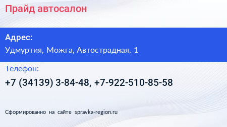 Прайд, автосалон по адресу Удмуртия, Можга, Автострадная, 1 в дальнейшем Организация, размещена в следующих категориях: