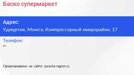 Баско, супермаркет по адресу Удмуртия, Можга, Компрессорный микрорайон, 17 в дальнейшем Организация, размещена в следующих категориях: