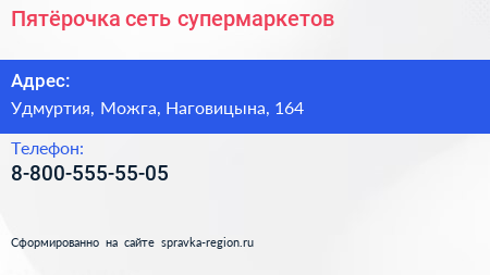 Пятёрочка, сеть супермаркетов по адресу Удмуртия, Можга, Наговицына, 164 в дальнейшем Организация, размещена в следующих категориях: