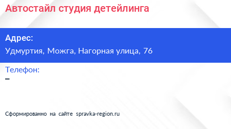 Автостайл, студия детейлинга по адресу Удмуртия, Можга, Нагорная улица, 76 в дальнейшем Организация, размещена в следующих категориях: