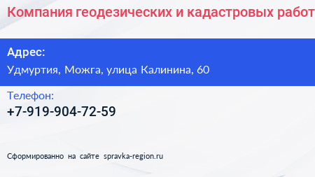 Компания геодезических и кадастровых работ по адресу Удмуртия, Можга, улица Калинина, 60 в дальнейшем Организация, размещена в следующих категориях: