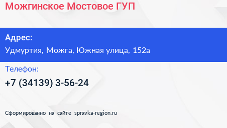 Можгинское Мостовое, ГУП по адресу Удмуртия, Можга, Южная улица, 152а в дальнейшем Организация, размещена в следующих категориях: