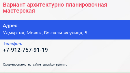 Вариант, архитектурно-планировочная мастерская по адресу Удмуртия, Можга, Вокзальная улица, 5 в дальнейшем Организация, размещена в следующих категориях: