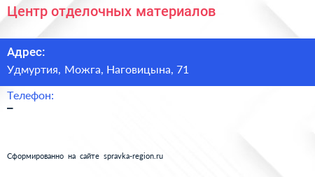 Центр отделочных материалов по адресу Удмуртия, Можга, Наговицына, 71 в дальнейшем Организация, размещена в следующих категориях: