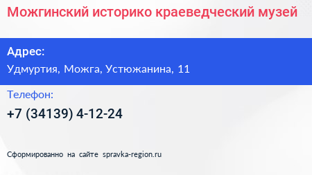 Можгинский историко-краеведческий музей по адресу Удмуртия, Можга, Устюжанина, 11 в дальнейшем Организация, размещена в следующих категориях: