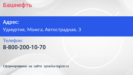 Башнефть по адресу Удмуртия, Можга, Автострадная, 3 в дальнейшем Организация, размещена в следующих категориях: