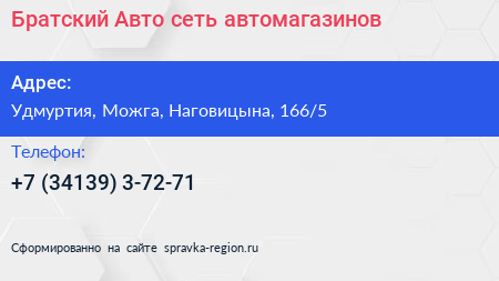 Братский Авто, сеть автомагазинов по адресу Удмуртия, Можга, Наговицына, 166/5 в дальнейшем Организация, размещена в следующих категориях: