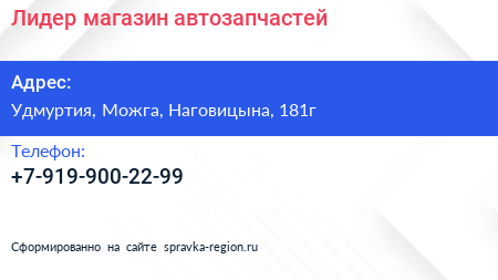 Лидер, магазин автозапчастей по адресу Удмуртия, Можга, Наговицына, 181г в дальнейшем Организация, размещена в следующих категориях: