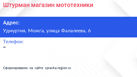 Штурман, магазин мототехники по адресу Удмуртия, Можга, улица Фалалеева, 6 в дальнейшем Организация, размещена в следующих категориях: