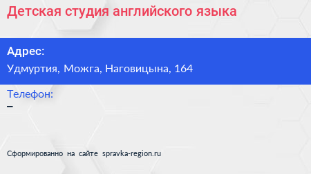 Детская студия английского языка по адресу Удмуртия, Можга, Наговицына, 164 в дальнейшем Организация, размещена в следующих категориях: