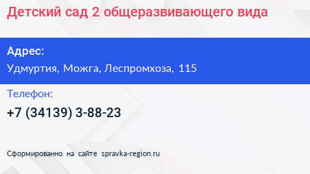 Детский сад №2 общеразвивающего вида по адресу Удмуртия, Можга, Леспромхоза, 115 в дальнейшем Организация, размещена в следующих категориях: