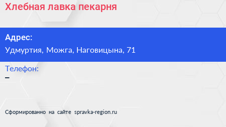 Хлебная лавка, пекарня по адресу Удмуртия, Можга, Наговицына, 71 в дальнейшем Организация, размещена в следующих категориях: