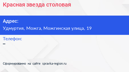 Красная звезда, столовая по адресу Удмуртия, Можга, Можгинская улица, 19 в дальнейшем Организация, размещена в следующих категориях: